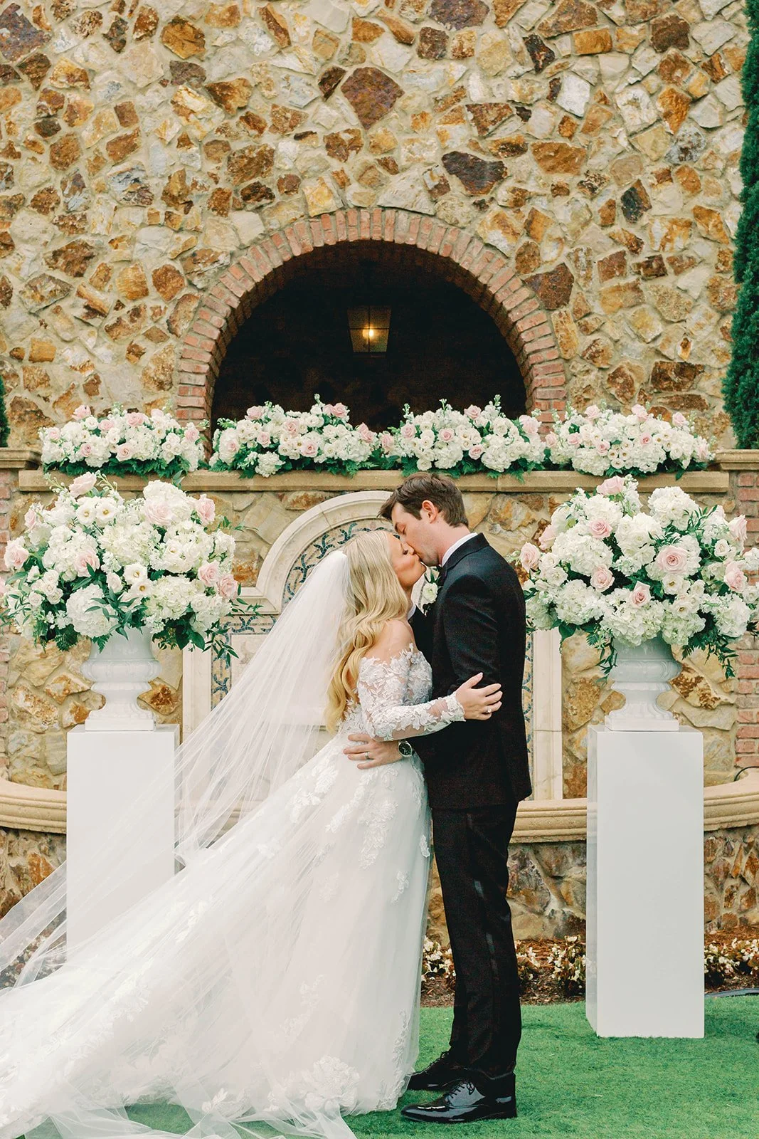 As the sun set, the celebration continued inside the magnificent ballroom, which had been transformed into a vision of romance and luxury. Long tables were graced with opulent floral runners, while small lush compote centerpieces added a touch of elegance to each setting. The crowning glory of the reception, however, was the large elevated floral centerpieces that adorned the space, giving the room an air of grandeur.